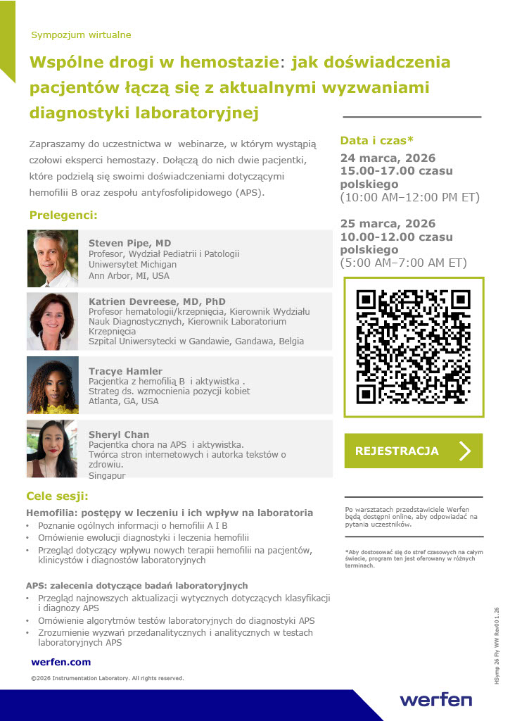Firma Werfen serdecznie zaprasza czytelników portalu hemostaza.edu.pl do udziału w wirtualnych warsztatach edukacyjnych organizowanych przez firmę Werfen "Wspólne drogi w hemostazie: jak doświadczenia pacjentów łączą się z aktualnymi wyzwaniami diagnostyki laboratoryjnej" (tytuł org. "Shared Journeys in Hemostasis: Connecting Patient Voices with Hot Topics in the Hemostasis Laboratory) w dniu 24 marca lub 25 marca 2026 r. (termin do wyboru).