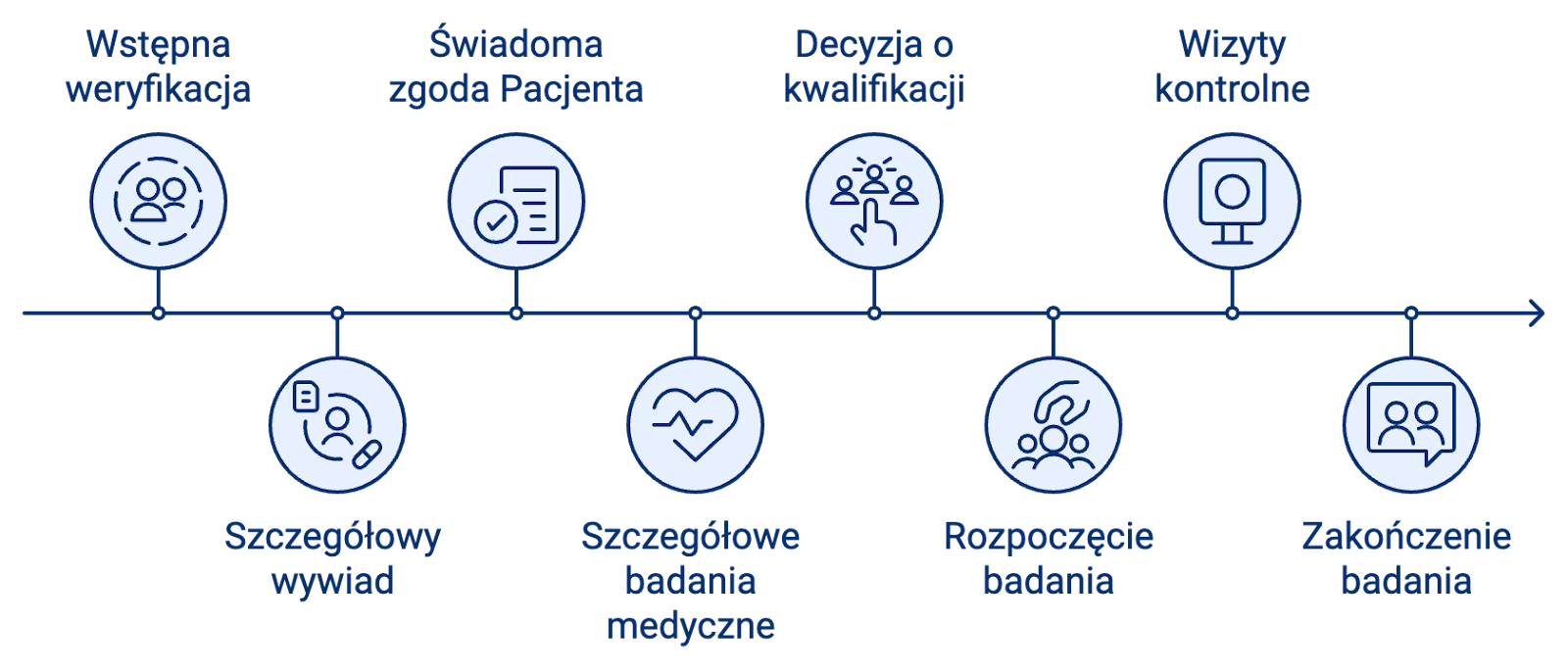 Po wstępnej rozmowie kolejnym etapem jest uzyskanie świadomej zgody - uczestnik musi zrozumieć, na czym polega badanie, jakie są możliwe korzyści i potencjalne ryzyka. Dopiero po jej podpisaniu rozpoczyna się seria szczegółowych badań kwalifikacyjnych, takich jak analizy krwi, EKG czy pomiar ciśnienia. Na ich podstawie oceniana jest możliwość formalnego włączenia do badania klinicznego. Więcej o świadomej zgodzie można przeczytać w przewodniku: Świadoma zgoda na udział w badaniu klinicznym - co powinieneś wiedzieć.