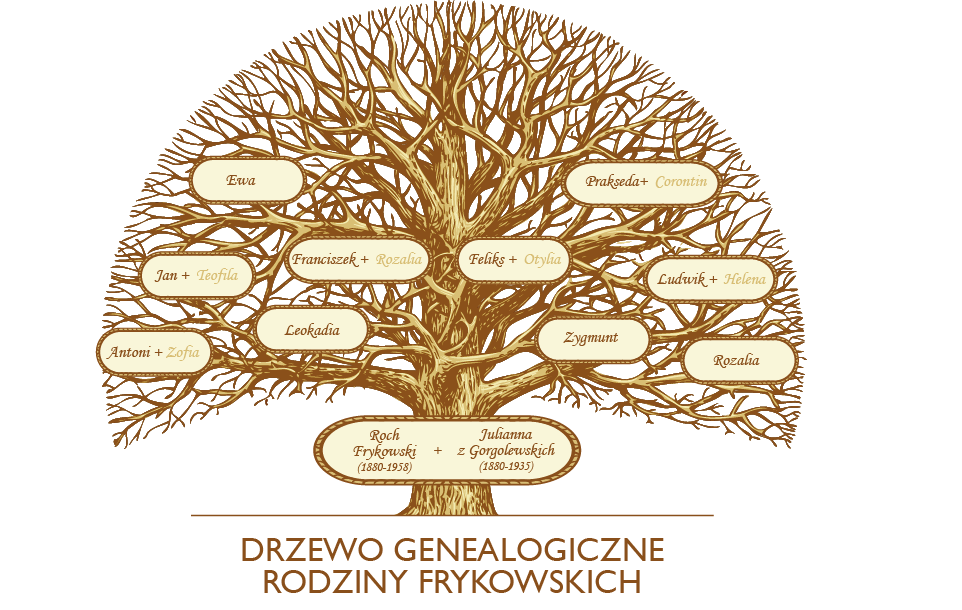 By ułatwić Czytelniczkom i Czytelnikom poruszanie się po meandrach tej opowieści, spróbuję przybliżyć fragment naszej genealogii. Zatem sięgnijmy do poziomu pradziadków, Julianny z Gorgolewskich i Rocha Frykowskiego. Pradziadkowie mieli dziesięcioro dzieci. Jak to w ówczesnych czasach bywało, nie wszystkie dzieci przeżyły okres wczesnodziecięcy, wiek dorosły osiągnęło ośmioro.